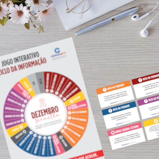 Jogo Interativo Mitos e Verdades HIV/AIDS Jogo de tabuleiro educativo para DDSs e treinamentos. Inclui tabuleiro, 40 cartas de mitos e verdades, 10 cartas de desafio, manual de instruções e gabarito. Promove aprendizado lúdico e quebra de estigmas.